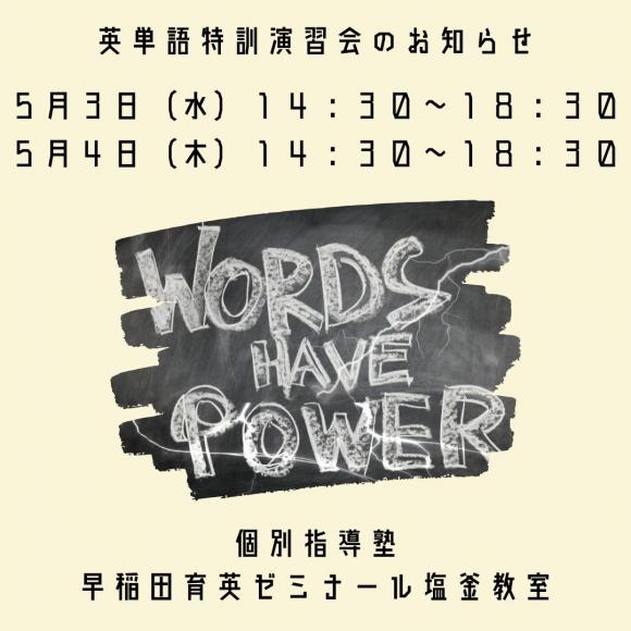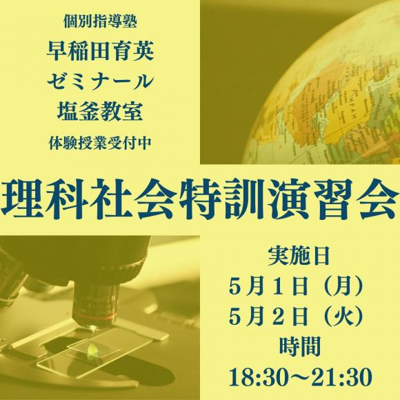 こんにちは、早稲田育英ゼミナール塩釜教室からのお知らせです。 当教室ではゴールデンウィークに合わせ、5月5日(金)〜5月7日(日)の期間、休塾いたします。 また、5月1日〜5月4日の期間は通常授業が休講となり、特別講座を実施します。 塾生の皆さんには申込書を配布しています。 参加希望者は期限までに申込書を提出してください。 外部生の方はお問い合わせください。 社会理科問題演習会 英単語特訓演習会 【宮城県塩竈市の個別指導塾】早稲田育英ゼミナール塩釜教室